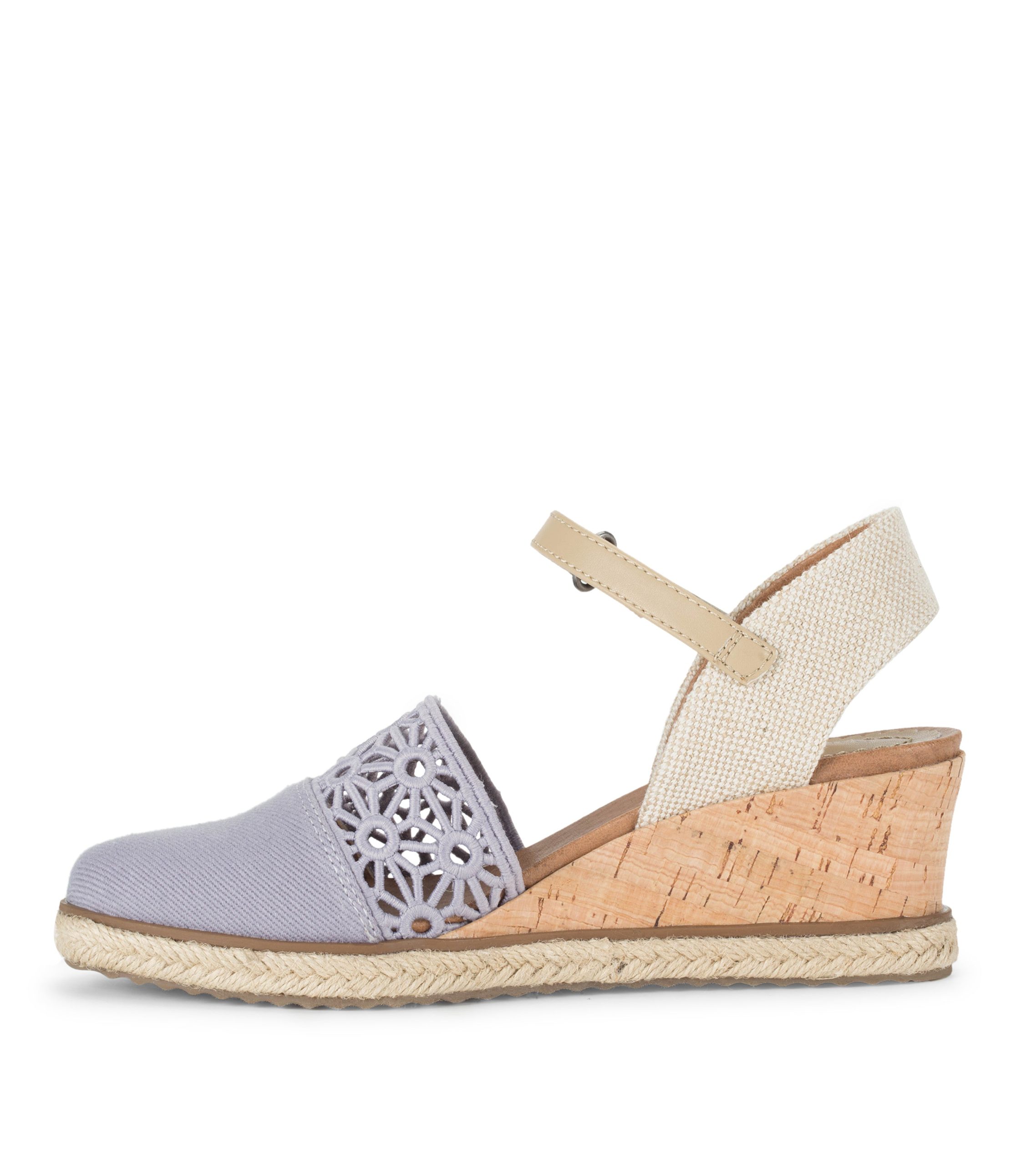 A cute floral pattern highlights the Baretraps Olicia wedge heel. An adjustable strap, comfy cushioned insole, and natural cork heel rounds out this versatile lightweight shoe.